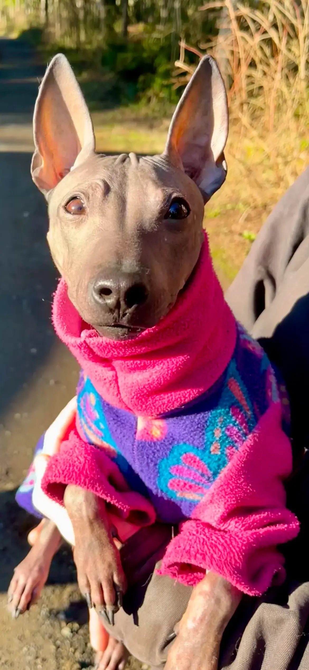 The broad, wedge-shaped head is a hallmark of this terrier variety. Erect V-shaped ears frame the round, expressive eyes that gleam with curiosity. The American Hairless moves with jaunty pep in his step that announces real terrier attitude.
